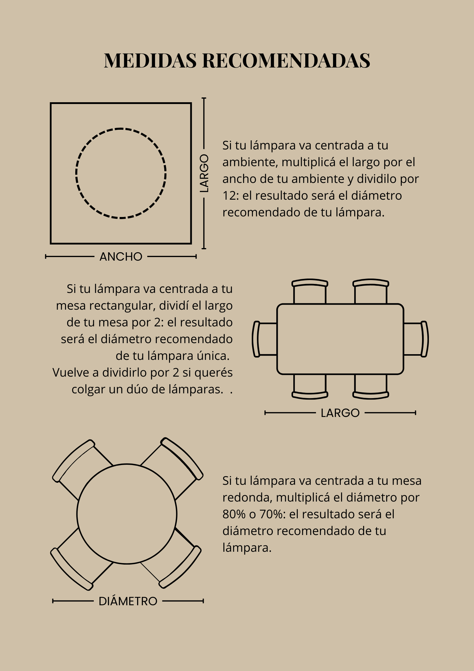 A continuación te detallamos cómo calcular la medida de tu lámpara según tu espacio. Recordá que sobre tu medida ideal podés jugar con un margen de +/- 20% , según el estilo de tu ambiente o presencia que quieras darle a la lámpara.